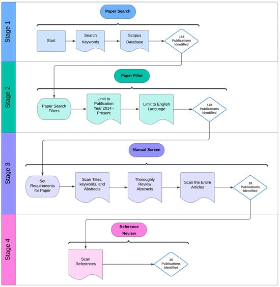 The literature review process comprised four stages, illustrated in Figure 3, commonly used in various research studies. For instance, Yi and Chan Albert [20] employed a similar process in their study on construction labor productivity, as did Xue, et al. [21] in their review of collaborative working in construction, and Ke, et al. [22] in their research on Public–Private Partnerships.