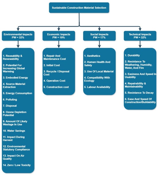 This study will assess the selection of sustainable construction materials from the perspectives of technical, economic, social, and environmental sustainability. In particular, innovative and advanced sustainable materials will be given greater emphasis on their technical impacts, which will increase their likelihood of being selected as preferred materials for sustainable construction in this study. There is a potential for academia to gain from systematically integrating the technical aspects with the commonly employed three pillars [46]. All identified criteria will be organized within these four categories.