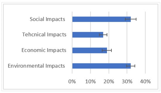 Ensuring the consistency of pairwise comparisons is crucial. To achieve this, the λmax value was computed, resulting in 4.0148. Subsequently, this λmax value was utilized to determine the CI, yielding a result of 0.0049. The CR was then calculated by dividing the CI by the RI, where the RI was determined by the number of evaluating criteria, equating to 0.9 for four criteria. Consequently, the CR was found to be 0.0055, which falls below the threshold of 0.1, indicating acceptable consistency in judgments. Finally, the priority weights, illustrated in Table 6, are now available for utilization in the selection process of sustainable construction materials. Figure 5 shows that the error margins calculated by the AHP Excel Template with Multiple Inputs [115] for environmental impacts, economic impacts, social impacts, and technical impacts are 2.3%, 2.5%, 2.1%, and 3%, respectively.