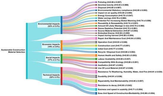 To determine the relative importance of the assessment criteria for materials based on survey data, a ranking analysis was conducted. Employing relative importance index analysis, the criteria were ranked according to their importance. Table 5 illustrates the ranking outcomes for each criterion derived from this analysis and their adjusted error margins. From these results, it was evident that 13 criteria were notably classified as possessing a “high” level of importance in the evaluation of sustainable construction materials, with II values ranging from 0.80 to 0.93.