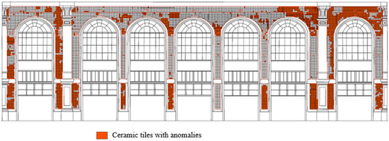 Maintenance actions were performed in the 1970s and 1980s to repair some detached tiles and to replace some missing tiles. In order to examine and register the station’s conservation state, an inspection campaign took place in July 2007 [11]. The inspection was divided by type of anomaly and area, namely the four elevations of the station (north, south, east and west). Figure 3 shows all tiles with anomalies on the west tile panel. Analysis of the photogrammetry, combined with an in situ assessment, revealed generalized tile degradation.