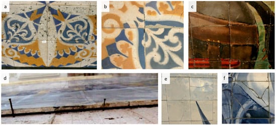 Anomalies: (a) tiles covered with gauze and dirt; (b) absence of joint space; (c) non-existent mortar for filling joints; (d) poor adherence or total detachment from the support; (e) cracked and/or fractured tiles; (f) uneven fragments [13].