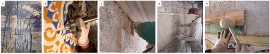 (a) Before cleaning; (b) electrical joints removal; (c) removal of existing mortar on the wall support; (d) application of new mortar; (e) reapplication of tiles [13].