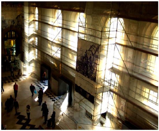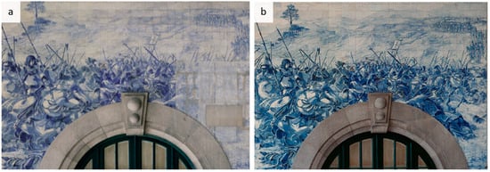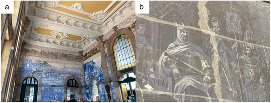 In Mediterranean countries, decorative panels of ceramic glazed tiles are a valuable part of cultural heritage, particularly in Portugal [6,7]. Azulejos, painted and glazed, ceramic tiles, were introduced into Portugal around the fifteenth century and became widely used as decorative elements in Portuguese architecture [8]. In Portugal, azulejo is a very important and iconic part of Portuguese heritage and considered one of the country’s most distinctive art forms [9]. As the most widely used ornamental device in Portuguese architecture from the fifteenth century onward, it constitutes a basic element in the study of the history of Portuguese art [10]. São Bento Station is home to tile panel that constitute one of the most emblematic works by Jorge Colaço, which features about 22,000 tiles. Dating from the first decade of the 20th century, each panel represents a national ethnographic or historical scene. In the upper part, there is a frieze of polychrome tiles that evokes the history of travel in Portugal. The set is made up of blue, white, and polychrome historic tile panels, and polychrome tile friezes with a geometric pattern.