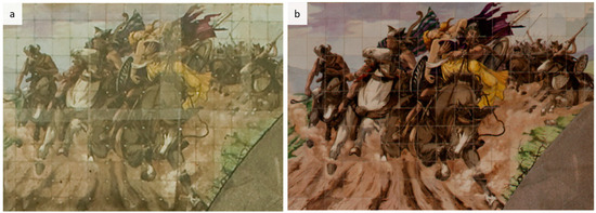 The methodology used [11] was the following: First, a primary cleaning was performed using a solution of neutral detergent in deionized water (Figure 5a). Next, a protective layer made of cotton gauze and a resin solution acrylic was applied. Before removing the tiles, labeling was necessary in order to guarantee their correct reapplication. Hence, a traditional method [7] was used, whereby a label with a code (letter and number) based on an axes scheme matrix (e.g., A1) was applied to each unit. After labeling, and if no other treatment alternatives were possible, the tiles were removed, starting with the manual and electric removal of the joint’s material (Figure 5b). Then, removal of the existing mortar on the wall support was carried out (Figure 5c), as well as of the mortar adhering to the back of the tiles. Cleaning of the surface, using both mechanical and chemical methods, was carried out in the laboratory. After cleaning, stabilization, glaze fixation and bonding of fractured elements was conducted. Bonding was executed using an acrylic resin solution.