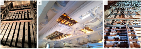 During the construction phase, the ceiling was divided into three sections: the south section, which took three months; the centre section, which was more degraded, took around five months; and the north section, which was the most degraded, took six months. However, the construction phasing had to be adapted on site, since the sisal takes approximately three months to dry. For this reason, after installing the first section, the intervention team would rearrange the scaffolding and move to the next section (Figure 11b). This allowed the first section to fully dry without compromising the final color. In addition, to protect the delicate marble pavements from scaffolding, protective plates were arranged underneath the scaffolds. At last, three coats of paint were necessary for an adequate repair of the ceiling. Figure 11 shows the ceiling before (a), during (b) and after (c) the intervention.