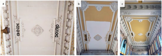 The ceiling of the entrance hall is a notable feature, with the inscriptions ”Douro” and “Minho” referring to the two train lines that depart from the station. In 2018, a significant section of plaster fell from the ceiling, which propelled the intervention. The most common anomalies on the ceiling included a mesh in the cracked area, salts, cracks in the plaster, humidity stains, loss of polychromy, and volumetric gaps in the plaster.