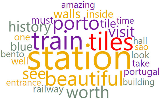 A Python web scraping method was used to automatically extract English reviews from tourists visiting S. Bento train station on TripAdvisor, between 2012 and 2023. These 4185 reviews revealed a word cloud (Figure 13) highlighting the most frequently used words. Notably, positive terms such as “beautiful”, “worth”, “history” and “amazing’ were commonly associated with this station, with a particular emphasis on its ceramic tiles (Figure 13).