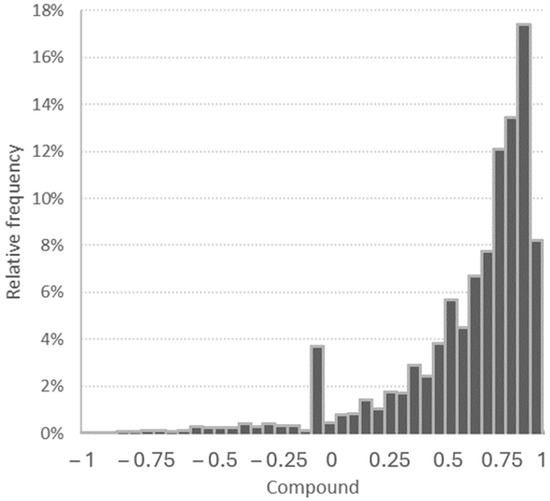 VADER, in particular, is noted for its effectiveness in analyzing sentiments in social media reviews. Its advantages include not requiring training data, support for emojis in sentiment classification, minimal performance trade-offs, and suitability for real-time applications. VADER assigns a polarity score (positive, negative, or neutral) to each word in its lexicon. A compound score ranging between −0.05 and 0.05 indicates neutrality, scores ≥0.05 to 1 indicate positive sentiment, and scores −1 to ≤−0.05 indicate negative sentiment [28]. However, the accuracy of sentiment analysis using VADER can be influenced by several factors, including language nuances. Misspellings, grammatical errors, sarcasm, and irony can lead to misinterpretations. Furthermore, specific jargon, nomenclature, and memes may not be recognized, while non-significant stop words and punctuation marks can alter sentiment polarity. VADER has demonstrated high accuracy when analyzing texts written in English, making it a reliable tool for sentiment analysis in this language.