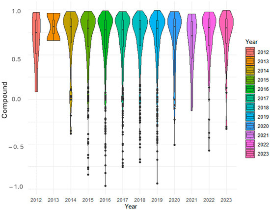 Figure 15 presents violin plots representing the overall sentiment scores and their distribution for each year. Except for 2013, which had only two reviews, all other years showed higher density points above 0.75. The highest mean scores were observed in 2023 (n = 59; mean = 0.71 ± 0.28), in 2022 (n = 128; mean = 0.70 ± 0.29) and in 2018 (n = 862; 0.69 ± 0.29). The lowest mean was obtained in 2021 (n = 38; mean= 0.64 ± 0.29). Between 2015 and 2019, although the majority of the reviews were positive, there were instances of strong negative sentiments expressed by some users, especially in 2015, 2016 and 2017 (Figure 15).