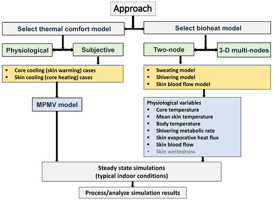The proposed approach addresses the research question: “Can physiological variables alternatively be used to indicate the psychological mean thermal sensation votes (MTSV) under the steady-state conditions?” To this end, the proposed approach combines an appropriate thermal comfort model with a physiological model of the human body to explore the relationships between the MTSV and physiological variables of an average nonsleeping young and healthy adult person under the euhydration state and therefore, identify suitable physiological variables. The perceptional MTSV is replaced by the predicted mean votes since they exhibit a linear relationship between them [12,13]. Figure 1 shows a schematic description of the general approach. The first step of the approach is to select the appropriate thermal comfort and bioheat models. Thermal comfort models can be grouped into subjective and physiological (using physiological variables such as the core and mean skin temperatures). The main criterion in selecting such a model is that the model should cover practical cases of core cooling (or skin warming) and skin cooling (or core warming). To the author’s knowledge, currently available thermal comfort models (except the MPMV model) do not cover core cooling cases that involve heat removal from the core section (e.g., by ingesting cold substances or drinks). Furthermore, steady-state physiologically based comfort models (such as those developed for transient conditions [7,55,57,58,59]) may carry some biases (inaccuracies) since they were developed on the assumption that the physiological variables can discriminate between thermal comfort levels (which is the question addressed in this paper). Similarly, bioheat models of the human body can be grouped into simple (single segment) or detailed (three-dimensional, multi-segment, and nodes). Selecting an appropriate model is based on its accuracy in modeling the thermoregulation system, particularly the evaporative sweating rate, non-shivering and shivering metabolic heat production, and skin blood flow. After selecting the appropriate thermal comfort and bioheat models, the next step is to conduct steady-state simulations under typical indoor conditions and then process and analyze the simulation results to establish the potential links between thermal comfort levels and physiological variables. In this paper, the new MPMV comfort index of [13] and the two-node bioheat model of [60] are selected to perform the analysis. In the following, further details have been added to the published work of MPMV [13] to account for non-zero mechanical work and heat removal from or addition to the body core section (readers are requested to consult the original publication for other details). Furthermore, some improvements have been introduced to the thermoregulation system of the two-node bioheat model of [60].