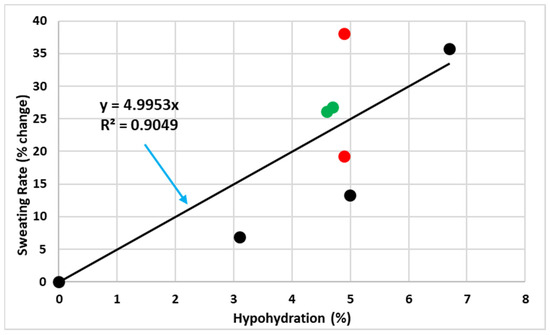 Effect of hypohydration (% body weight) on the sweating rate (% reduction from the euhydration state) of a dehydrated person. Black dots are from Sawka et al. [66]; red dots are from Sawka et al. [67]; and green dots are from Buono and Wall [68].