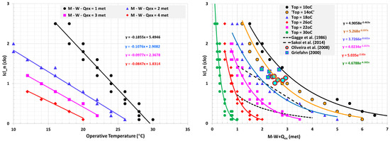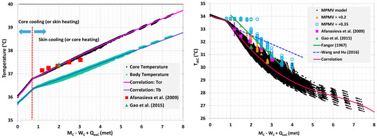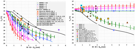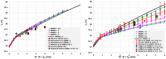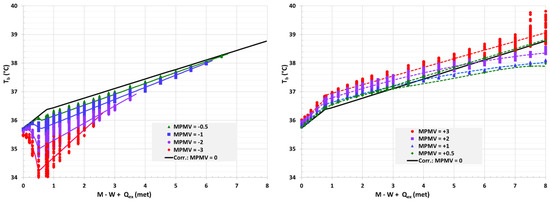 Figure 8 shows the relationships between the body temperature and the net metabolic rate at the seven levels (−3 to +3) of thermal sensation as indicated by MPMV. Equations for data fitting at each comfort level (correlation lines) are given in Table A3. The body temperature misses to represent all seven comfort levels, due to the intersection with the neutral comfort zone (0 ≤ MPMV < +1). Under cold exposure conditions with MPMV ≤ 0 (left Figure), the body temperature shows distinguished profiles by decreasing with the comfort level and increasing with the net metabolic rate, except for core cooling situations (net metabolic rate < Mb) where it decreases for the comfort levels below the neutral zone (MPMV < −0.5). The effects of the environmental and personal parameters on the body temperature (as indicated by the data scatter around the average trends) may be significant, particularly at low net metabolic rates (<2 met). Under hot exposure conditions (MPMV ≥ 0), the body temperature increases with the net metabolic rate but misses to distinguish the comfort levels from the neutral zone (MPMV < +1) due to the NST presence. For the comfort levels where NST is suppressed by exercise internal heat generation (MPMV ≥ +1), the body temperature steadily increases with the comfort level. However, within the comfort zone (0 < MPMV < +1), the body temperature may take two different solutions corresponding to the presence and absence of NST without altering the thermal perception. The results with the NST presence are close to the neutral body temperature at MPMV = 0, and the ones without NST presence are close to the body temperature at MPMV = +1. The effects of the environmental and personal parameters are less significant compared to the cold exposure conditions.