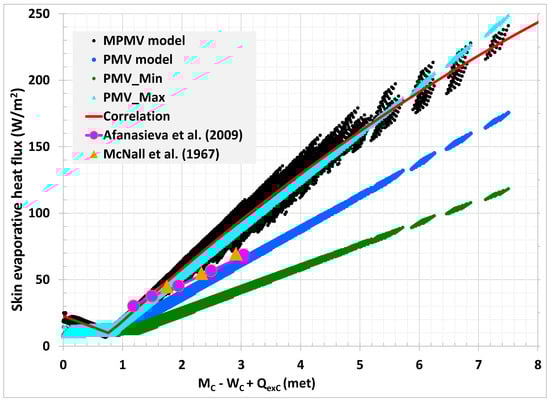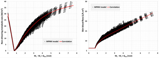 Figure 4 and Figure 5 show the relationships between the skin evaporative heat flux, non-shivering metabolic rate (NST), skin blood flow, and the net metabolic rate (NM = Mc − Wc − QexC) at the neutral comfort state. The formula of Fanger [83] for the evaporative heat flux used in the PMV model with its lower (Esw,min) and upper (Esw,max) bounds, as taken from Bartal et al. [88] and given by Equations (12) and (13) below, are also shown in Figure 4 for comparison.