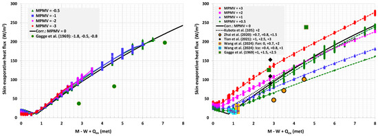 Figure 9 shows the relationships between the skin evaporative heat flux and the net metabolic rate at the seven levels (−3 to +3) of thermal sensation as indicated by MPMV. Results from several public studies are also included for comparison. Equations for data fitting at each comfort level (correlation lines) are given in Table A4. For all comfort levels, the skin evaporative heat flux increases with the net metabolic rate for skin cooling situations but slightly decreases for core cooling situations (net metabolic rate < Mb). Furthermore, the effects of the environmental and personal parameters (as indicated by the data scatter around the average trends) seem not significant for all levels of thermal sensation, except for the neutral level (0) as discussed before (Figure 4). However, the skin evaporative heat flux is not suitable to represent all comfort levels due to the intersection with the neutral comfort zone (0 ≤ MPMV < +1). Under cold exposure conditions with MPMV ≤ 0 (left Figure), the skin evaporative heat flux shows a very weak sensitivity to the comfort level to the point that the skin evaporative heat flux at the comfort levels of −1 to −3 is not significantly different from the one at the neutral comfort level (MPMV = 0). Under hot exposure conditions (MPMV ≥ 0), the skin evaporative heat flux shows, however, distinguished variations with the level of thermal comfort beyond the neutral comfort zone (MPMV ≥ +1). Within the comfort zone (0 < MPMV < +1), the skin evaporative heat flux may take two different solutions corresponding to the presence and absence of NST without altering the thermal perception. The results with the NST presence (more frequent) are close to the neutral trend at MPMV = 0, and the one without the NST presence (less frequent) is slightly below the trend at MPMV = +1. The experimental data from the public studies are overall in good agreement with the predictions. Under hot exposure conditions (right Figure), the formulation of Kubota et al. [104] for MPMV = +2 agrees very well with the corresponding predicted trends (note Kubota et al. calculations for the comfort levels of +1 and +3 are not very different from that at +2). Kuboda et al. [104] assumed that the regulatory sweating rate is the sum of two components, one representing the regulatory comfort sweating (formula of Fanger [83]) and the second one is due to exercising. The latter component was assumed to be linearly proportional to the deviation of the steady-state mean skin temperature (Tsk) from its comfort value (TskC, taken as well from Fanger [83]). The formula for the skin evaporative heat flux (Esw,k, W/m2) by accounting for the sweat efficiency (ηsw) is expressed as follows:
