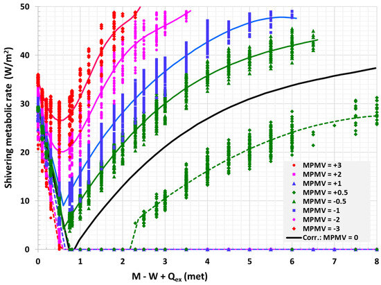 Figure 10 shows the relationships between the shivering (including NST) metabolic heat production and the net metabolic rate (NM) at the seven levels (−3 to +3) of thermal sensation as indicated by MPMV. Equations for data fitting at each comfort level (correlation lines) are given in Table A5. As expected, shivering metabolic rate is present for cold exposure conditions (MPMV ≤ 0), for which it increases with the net metabolic rate for skin cooling situations (NM > Mb) but decreases for core cooling situations. For the latter, shivering metabolic heat production is activated by the central cold receptors [105], whereas for skin cooling situations it is activated by the peripheral cold receptors [106]. Under the neutral comfort range (−0.5 ≤ MPMV ≤ +0.5), NST represents about 8% to 17% of the net metabolic rate. This is consistent with prior studies reporting 10% to 28% [69,93]. However, under hot exposure conditions (MPMV ≥ 0), the shivering metabolic heat production exists only for core cooling situations with the exception of the comfort zone around +0.5 (0 < MPMV < +1), where NST may be present for skin cooling situations, particularly when the environmental and personal parameters combined with exercise metabolic heat production are unable to balance the body heat loss and suppress NST. For skin cooling cases, the model predictions at MPMV = +0.5 show that NST is completely suppressed when the net metabolic rate is lower than 2.3 met. Above this limit, NST may continue to grow with the net metabolic rate due to decreasing mean skin temperature (Figure 7), which in turn will strengthen the afferent signals of the peripheral cold receptors. Under these skin cooling situations with net metabolic rates > 2.3 met, two physiological solutions (without altering the thermal perception) may co-exist, corresponding to the presence (with more frequent occurrences) and absence (with less frequent occurrences) of NST, depending on the effects of the environmental conditions and clothing insulation of subjects. The co-existence of shivering metabolic heat production with exercise activities, depending on the level of body cooling and exercise intensity, is supported by prior studies [80,107,108]. However, the co-existence of two physiological solutions for the neutral comfort zone (0 < MPMV < +1) will need further research, particularly to detect the less frequent occurrences of the second solution without the presence of NST. The first and most frequent solution with the presence of NST under high metabolic rates is supported by various experimental data as shown in Figure 6 and Figure 7. It should be noted that the environmental and personal parameters (as indicated by the data scatter around the average trend) may have significant effects on the shivering metabolic heat production, particularly for cooler thermal sensation levels (MPMV < −1).