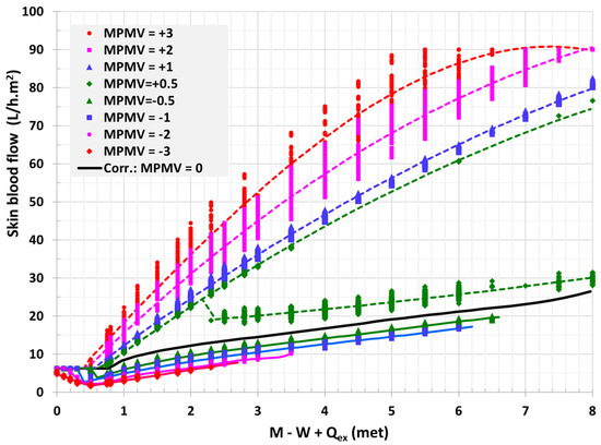 Figure 11 shows the relationships between the skin blood flow and the net metabolic rate at the seven levels (−3 to +3) of thermal sensation as indicated by MPMV. Equations for data fitting at each comfort level (correlation lines) are given in Table A6. Similar to the mean skin temperature (Figure 7), the skin blood flow shows distinguished variations with the net metabolic rate and comfort level. The skin blood flow may therefore be used to indicate thermal comfort levels, except for the comfort zone (0 < MPMV < +1) where two solutions may co-exist corresponding to the presence and absence of NST. Under cold exposure conditions with MPMV ≤ 0, the skin blood flow steadily decreases with the comfort level, but within a thin range (maximum deviation < 8 L/h/m2) due to increasing vasoconstriction. Furthermore, the skin blood flow increases with the net metabolic rate for skin cooling situations (due to increasing vasodilation) but slightly decreases for core cooling situations. The effects of the environmental and personal parameters are also not significant. However, under hot exposure conditions with MPMV ≥ 0, the skin blood flow significantly increases with the comfort level and net metabolic rate until reaching its maximum value (fixed to 90 L/h/m2) for skin cooling situations due to increasing vasodilation. For the comfort zone (0 < MPMV < +1), the skin blood flow may take two different solutions with a maximum difference between the two reaching 42 L/h/m2. Under this hot exposure case, the effects of the environmental and personal parameters are significant, particularly at high comfort levels (MPMV > +1).