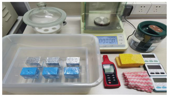 Capillary absorption experiments, using the material’s own capillary pressure as the driving force, were conducted for this study. By measuring the transient distribution of moisture content in the specimens, a one-dimensional moisture transfer process was established. Specific experimental methods and equipment settings refer to the current international standard ISO 15148:2002 (E) [37]. Before the experiment began, it was necessary to dry and cure the specimens and measure and record their initial weights (), soaking surface areas A (), and heights H (). Specimens were weighed at regular intervals during the experiments to determine the moisture-content weight (), and the weight-change of the moisture content inside the specimens at the corresponding time point was calculated as = (). The experimental setup is shown in Figure 1.