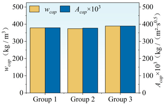 To verify the reliability of the subsequent experimental results, gypsum was selected as the control material for the capillary water absorption experiments. The measurements of the specimens are mentioned in Table 1, above. After drying and curing, the test piece is sealed with the same sealing material. Two specimens are grouped together, and parallel experiments are conducted in three groups under the constant temperature and humidity conditions of 21 °C and 50% relative humidity. During the experiment, the water level in the tank was closely monitored, and the water lost through evaporation was regularly replenished. Based on the average of the experimental results for each group, the water absorption coefficient and capillary-saturation moisture content were calculated, as shown in Figure 2.