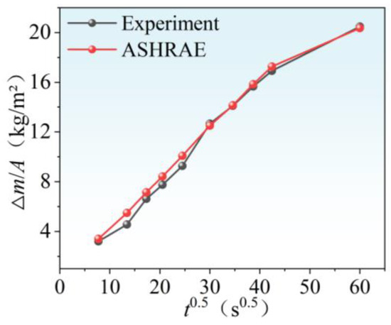 The differences between the three sets of experimental data were within the allowable range of the experimental repeatability error. The average value was used for curve fitting and compared with the data from the measurements in the ASHRAE 1018RP project [15]. The comparison results of the water absorption coefficient are shown in Figure 3 and Table 2.