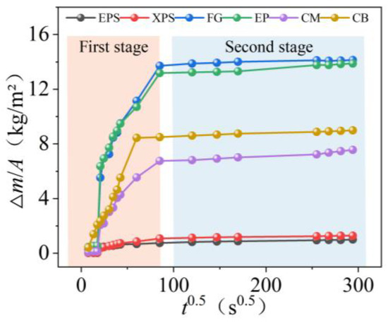 The linear fitting of experimental results takes the square root of different measurement periods () as the X-axis and the water absorption per unit area /A () as the Y-axis. Linear fitting was performed for the two stages of the capillary water absorption process. The slope of the fitting line in the rapid water absorption stage (the first stage) is the capillary water absorption coefficient ((·)) of the porous material, and its calculation formula is shown in Equation (1):