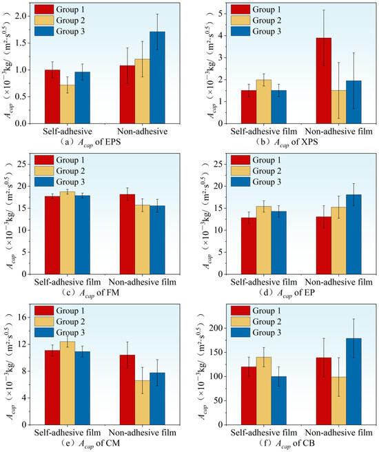 To avoid a reaction between the epoxy resin and the specimens, which might affect the experimental results, and considering the practice of using waterproof construction layers in actual engineering, we decided to use self-adhesive and non-adhesive films as sealing materials for comparative experiments. Regarding the influence of these two types of films on the results of capillary water absorption experiments, some scholars have studied the effects of different thin films on the test results for and of four materials, including calcium silicate. They concluded that the experimental results obtained using different films were similar [35]. Owing to the limited variety of samples tested and the fact that the difference between the two experimental results for the autoclaved aerated concrete, among the four test materials, was much greater than the repeatability error, it cannot be asserted that the two films have no effect on the experimental results. In this study, under identical conditions, each test material was divided into three groups, with each group consisting of two specimens of the same type, each specimen was treated with different sealing materials, using both self-adhesive and non-adhesive films, to conduct a comparative experiment; the experimental results are shown in Figure 5.