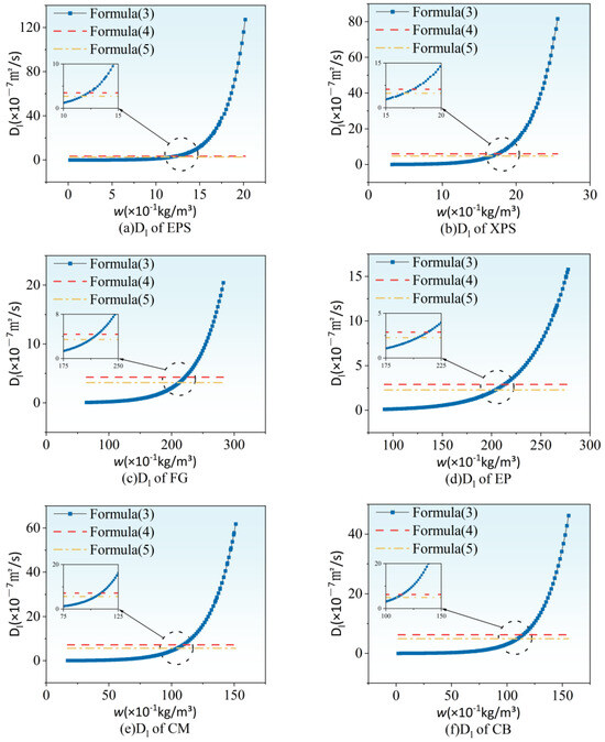 As shown in Figure 6 and Table 5, the fitting curves for the five materials, as obtained using Formula (3), closely match the curves obtained from estimations using Formula (4) and Formula (5) in terms of magnitude before the material reaches its capillary-saturation moisture content. Moreover, compared to estimation of Formula (4), the modified estimation of Formula (5) provides a closer fit to the liquid-water diffusion coefficient results calculated from Formula (3), as moisture content varies. Further analysis reveals that the interval where the liquid-water diffusion coefficient begins to increase sharply occurs near the intersection points of the three fitting curves (as shown in the magnified sections of Figure 6). Based on this observation, the concept of critical capillary moisture content is introduced. Before reaching this critical value, the results obtained from a constant model and a variable model differ only slightly in magnitude, making it feasible to use the constant model to simplify calculations in practical applications. The capillary moisture-content values at the intersection points of the fitting curves for the six materials were calculated, and the results are shown in Table 6.