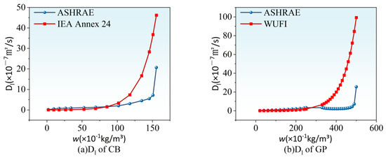 The liquid-water diffusion coefficient values of each material, calculated using Formula (6).