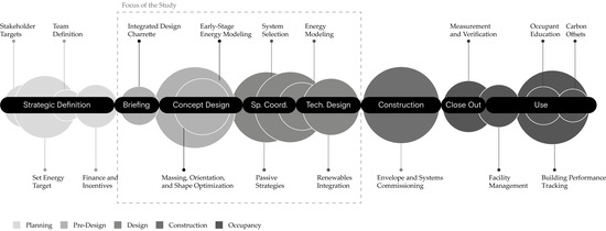 “Phases of the building design lifecycle—Each phase is depicted with a distinct color to denote the corresponding phase, while the circle dimension indicates the level of influence on the project’s energy efficiency and sustainability outcomes” (adapted from [66]).