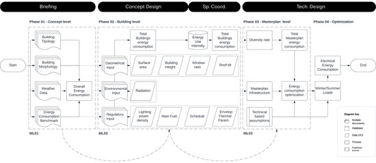 In the initial phase, related to the concept level (Phase 1), the integration of machine learning can impact the schematic design stage by rapidly synthesizing and interpreting vast datasets to identify optimal design configurations (overall strategy) and energy needs (building scale). This can lead to a reduction in design time and enable a more informed decision-making process regarding the building envelope’s performance characteristics.