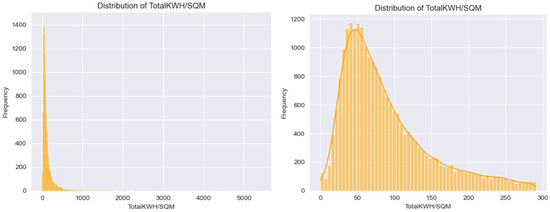 Figure 3 illustrates the EUI distribution in the combined dataset. On the left is the original distribution, and on the right is the cleaned one, consisting of 22,865 measurements (against the 24,932 measurements of the original combined dataset). The frequency decreased from approximately 1400 to 1200 due to the removal of outliers, which were data points falling outside 1.5 times the interquartile range. This cleaning process helped ensure that the dataset better represented typical energy use patterns, improving the accuracy of subsequent predictive modeling.