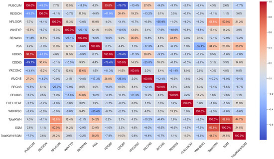 The simulation process commences with data preprocessing, where the dataset is refined to include only the most pertinent variables in the analysis. The simulation process began by combining the two selected datasets, CBECS and RECS, as described previously. Initial data visualization, using histograms and heatmaps, helped us understand the distribution of energy consumption and identify inter-variable relationships. Outlier detection algorithms were employed to identify and exclude anomalous data points that could negatively impact prediction accuracy. Specifically, the combined data were normalized—removing outliers—based on the EUI metric (measured in kWh/m2). Any data points that fell outside 1.5 times the interquartile range were excluded. This step mitigated the influence of anomalous observations that could skew the predictions, without oversimplifying the dataset. The original dataset consisted of 24,932 rows, and 22,865 after the initial data cleaning.