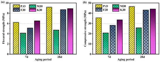 Flexural and compressive strength at 7 days and 28 days: (a) flexural strength and (b) compressive strength.