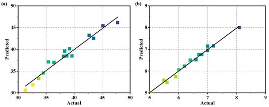 To better illustrate the credibility of the fitted models for compressive and flexural strength, confirmation is provided through a comparison between measured values and predicted values in Figure 2. In the graph, the scattered points represent the measured values, while the diagonal line represents the predicted values. The greater the distance between points and the diagonal line, the lower the accuracy of prediction. The smaller deviations above and below the diagonal line indicate lower errors. From Figure 2, it can be observed that the points are evenly distributed and close to the diagonal line, with no outliers present. This indicates that the model’s predicted results closely align with the actual values, demonstrating a good fit for both compressive and flexural strength models and exhibiting high applicability.