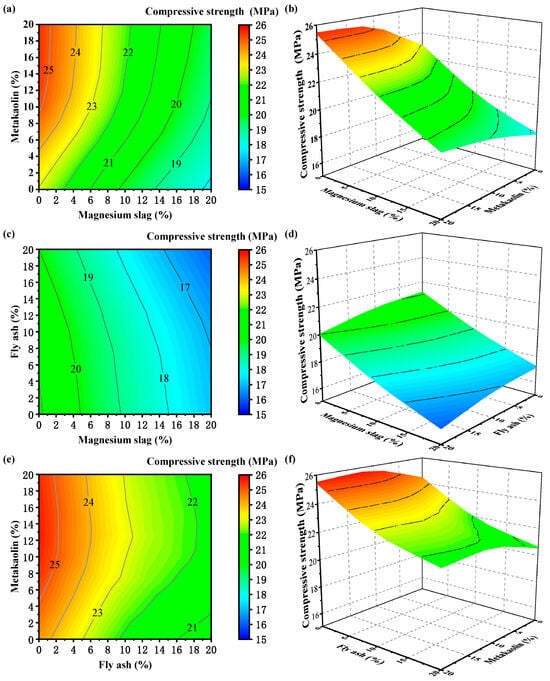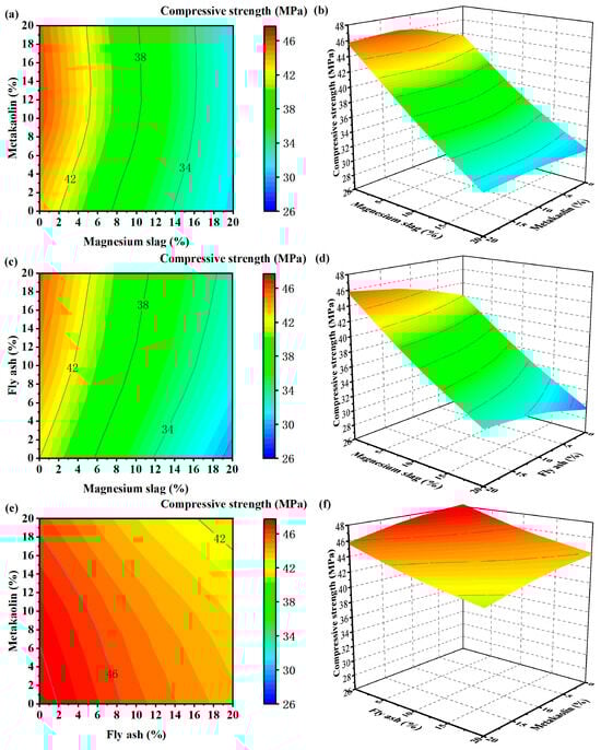 Contour and 3D surface plot of compressive strength at 28 days: (a) contour plot—magnesium slag and metakaolin; (b) 3D surface plot—magnesium slag and metakaolin; (c) contour plot—magnesium slag and fly ash; (d) 3D surface plot—magnesium slag and fly ash; (e) contour plot—fly ash and metakaolin; and (f) 3D surface plot—fly ash and metakaolin.
