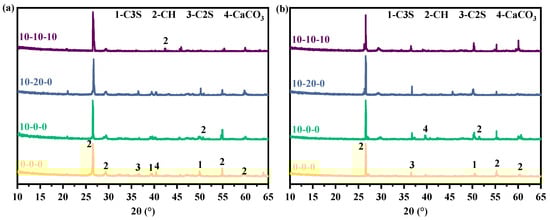 XRD patterns of magnesium slag specimens: (a) 3 days and (b) 28 days.