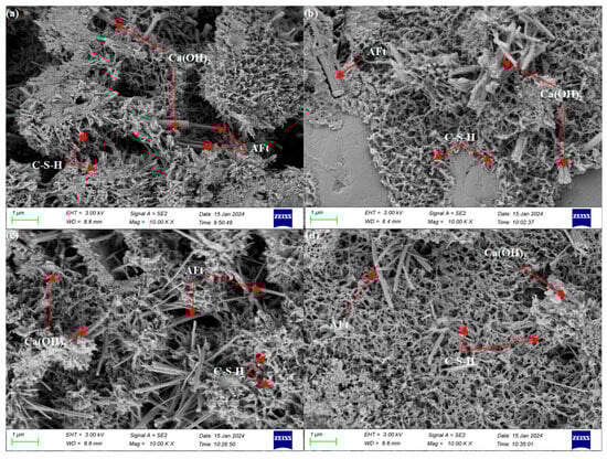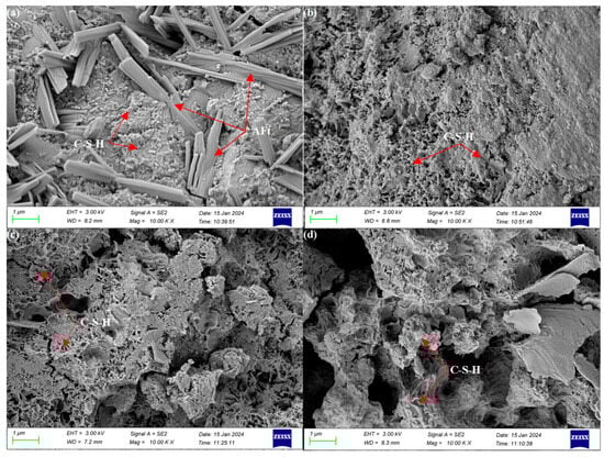 The microscopic morphology of hydration for 3 days is depicted in Figure 6. The hydration products of both pure cement and composite system cementitious materials are dominated by amorphous C-S-H gel, with a minimal portion of needle-and-rod shaped ettringite (AFt) interspersed and bridged in between. At 3 days of hydration, a large amount of C-S-H gel is generated, and a minimal portion of Ca(OH)2 and AFt are interspersed with it, forming a network-like structure. In the sample with 10% magnesium slag, a minimal portion of AFt, C-S-H gel, and Ca(OH)2 are generated, and some block structure is interspersed in the gel. That is because only a minimal portion of reactive CaO inside the magnesium slag particles could undergo the hydration reaction, and the unreacted magnesium slag particles split up the hydration reaction system. And the C-S-H could not be connected into a whole, which made the early strength lower. When magnesium slag, cement, and fly ash are co-mingled, the fly ash hardly undergoes a hydration reaction, and the quantity of C-S-H gel formed is reduced. This is due to the internal vitreous body of fly ash, which contains a dense vitreous surface layer, hindering the interaction of active substances with water []. When magnesium slag, fly ash, and metakaolin are compounded, the metakaolin contains a large amount of active SiO2 and Al2O3, which forms hydrated calcium silicate in the early stage. Al3+ also replaces Si4+ in the silica-oxygen tetrahedra to form aluminosilicate gels, which are uniformly distributed in the system to form a dense network-connected structure that provides high early strength [].