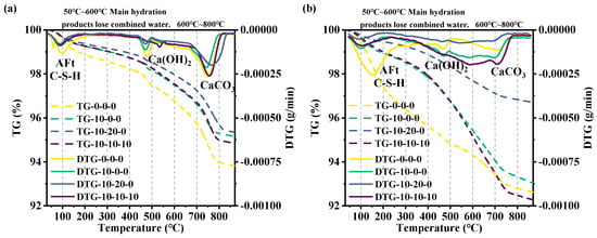The TG-DTG curves of the composite cementitious system at 3-day and 28-day hydration are depicted in Figure 8. Dehydration of the main hydration products of cementitious materials occurs at 50 °C~600 °C. AFt dehydrates near 100 °C, and C-S-H gel dehydrates at 50 °C~450 °C. Ca(OH)2 dehydrates at 450 °C~550 °C to produce CaO. When the temperature increases to 700 °C~800 °C, CaCO3 decomposes to form CaO. It can be seen that the TG-DTG curves of several groups of blended pastes are basically the same, and three weight loss stages are evident, each corresponding to three peaks of heat absorption. C-S-H exists in a gel state without forming weight loss or heat absorption peaks. However, its dehydration occurs throughout the entire process. The DTG curves of both composite cementitious systems and pure cement have an obvious heat absorption peak near 100 °C, which is caused by the dehydration of ettringite and C-S-H gel []. The DTG curves of pure cement and specimens with magnesium slag alone have a distinct heat absorption peak near 470 °C. This is a dehydration reaction of Ca(OH)2, whereas the peak did not appear in the test group doped with fly ash, indicating that the cementitious material containing fly ash is completely consumed by the generated Ca(OH)2 at the late stage of the hydration reaction. At 3 days, the TG curves showed two significant weight loss changes in both pure cement and composite cementitious systems around 100 °C and 470 °C. With the overall weight loss of pure cement reaching, the weight loss of pure cement is 5.9%, while that of composite cementitious system is around 4.7%. At 28 days, the TG curves showed that there are two obvious weight loss changes in both pure cement and composite cementitious systems at around 150 °C and 470 °C, with an overall weight loss of 7%. Due to the high activity of metakaolin, Ca(OH)2 produced by early hydration is consumed in large quantities, and Ca(OH)2 is consumed by fly ash in large quantities at the hydration age of 28 days, so the content of Ca(OH)2 is low.