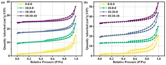 The adsorption of specimens with different ratios at different ages tested by BET is shown in Figure 9, and the pore distribution is shown in Figure 10 and Table 13. When P/Po is between 0 and 0.4, almost no N2 adsorption occurred. When P/Po is between 0.4 and 1, a hysteresis loop appears in the region. In accordance with the IUPAC classification criteria, the adsorption–desorption isotherms are found to belong to type IV, while the samples had H3 hysteresis loops in the region of high relative pressures, indicating that the pore structure is incomplete []. There is a significant difference in the pore size distribution among the four groups of samples. The average pore size increases in the hardened samples doped with magnesium slag alone and with both magnesium slag and fly ash at the hydration age of 3 days. This is because fly ash and magnesium slag have low hydration rates in the early stage and cannot form the gel material with a smaller pore size. In contrast, metakaolin can rapidly undergo a hydration reaction to yield C-S-H gel, resulting in significant production of gel material to occupy the large pores []. Therefore, the average pore size of the hardened specimen with magnesium slag, fly ash, and metakaolin is reduced. When the hydration age is 28 days, single doping of magnesium slag will still make the average pore size increase. There are two reasons for this. One is that the fineness of magnesium slag particles is larger than cement particles, which cannot fill some large pores by physical filling. The second is that the magnesium slag particles themselves are less active, and it is difficult to generate the gel material with smaller pore size by sufficient hydration reaction. It is noteworthy that the average pore size of the hardened specimens, post-compounding with magnesium slag and fly ash, is smaller than that of the reference specimens composed solely of pure cement. This is due to the involvement of fly ash in the later stages of the hydration reaction, which is consistent with the SEM observations. Whereas, when magnesium slag, fly ash, metakaolin, and cement are compounded, the highly reactive metakaolin and fly ash undergo a full hydration reaction, generating a large amount of gelatinous material and other products that fill the voids of the reactants, and hence the average pore size decreased.
