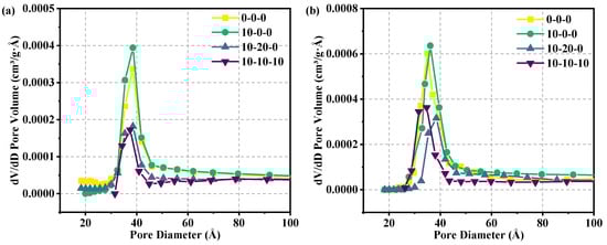 Pore size distribution of various samples: (a) 3 days and (b) 28 days.
