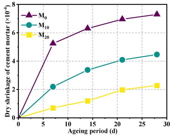 Cement specimens decrease in volume due to internal hydration, which causes the specimen to shrink. The expansion of magnesium slag occurs post-hydration owing to the presence of unbound calcium oxide and magnesium oxide. Therefore, mixing magnesium slag into cement specimens can compensate for the self-shrinkage of cement specimens. In this paper, a separate experimental program is designed. A range of 0~30% of magnesium slag is mixed in cement mortar so as to explore the effect of magnesium slag on the dry shrinkage properties of cement mortar. The controlled drying environment is set at 20 °C with 50% relative humidity, and the mix proportions of the dry shrinkage test are provided in Table 5.