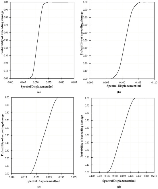 88]. The probability of the bridge structure reaching various damage states at different spectral displacements is estimated using Equation (4), where dispersion (β) standardizes the normalized values of the natural logarithm of the ratio between spectral displacement and the median spectral displacement. This standardization process is carried out through the application of the normal cumulative distribution function. Following the calculation of probabilities using the lognormal cumulative distribution function, fragility curves are generated.