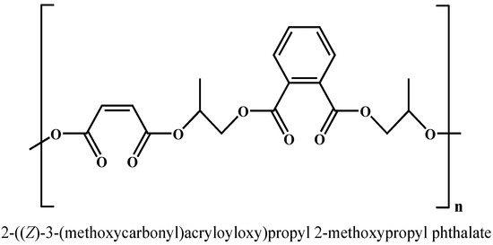 The resin used in this study was a thixotropic, pre-accelerated, medium-viscosity thermosetting Ortho phthalic-based unsaturated polyester resin (UPR), “TP200TICO”, manufactured by Turquoise Polyester Resin Chemistry San. Tic. Ltd. (İzmir, Turkey). Figure 1 illustrates the chemical formula of the UPR as reported in [30]. The curing of this resin was carried out using a solution of methyl ethyl ketone peroxide (PMEC dissolved in dimethyl phthalate), type “BUTANOX M-50”. The physical characteristics of the UPR and PMEC are provided in Table 1 [31,32]. Notably, the UPR and PMEC have comparable densities ranging between 1.08 and 1.18, but their viscosities differ by a factor of 1000, which enables rheological adjustments in the fresh state and ensures good structural homogeneity after curing. The mechanical, thermal, and electrical properties of the resin used are shown in Table 2. Its compressive strength and elastic modulus are 80 MPa and 2 GPa, respectively. For thermal and electrical conductivity, the values are 0.28 W/m·K and 3.7 mS/cm, respectively.