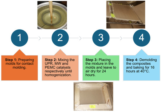 The samples were prepared as detailed in Figure 3. Initially, the UPR matrix was thoroughly mixed by hand using a manual mixing tool, with the MW reinforcement added in concentrations ranging from 0% to 20 wt.% of the UPR, with a stepwise variation of 5%. Subsequently, the PMEC catalyst, at 2% by weight of the UPR, was added and gently mixed until the mixture was uniformly homogenized. After mixing, the final mixture was poured into a pre-prepared wood mold, placed on a Teflon-coated glass plate measuring 113.6 × 173.6 × 4 mm3. The samples were left to cure at room temperature for 24 h before being demolded and then placed in the oven for post-curing at 40 °C for 16 h, according to the recommendations of Perrot et al. [14,34].