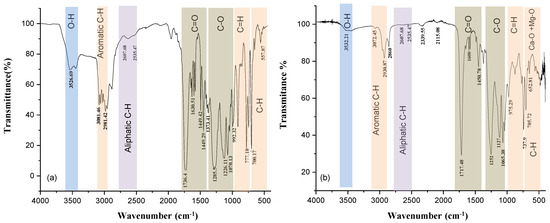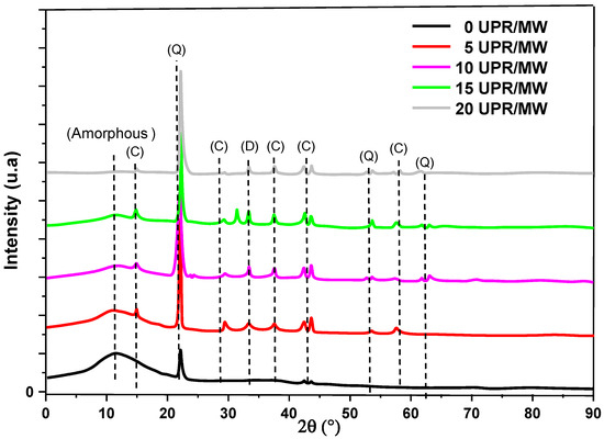 Regarding UPR/MW composites, their FTIR results are illustrated in Figure 4b. All spectra of the UPR/MW composites are similar, for all MW rates. Indeed, all spectra of UPR/MW composites are similar to those of pure UPRs, with the exception of an attenuation of all peaks between 3600 and 750 cm−1. This attenuation can be explained by the replacement of pure UPRs by MW. According to the literature, marble displays no peaks in this region between 4000 and 1600 cm−1 [26]. Moreover, a few additional peaks are present in the region between 750 and 400 cm−1 related to Ca-O and Mg-O bonding. This is due to the presence of MW particles in the composites. These peaks correspond to magnesium oxide and carbonates as shown by Khan et al. [51]. The presence of magnesium oxide and carbonates is confirmed by the X-ray diffraction results presented in Section 3.3, which show the presence of calcite (CaCO3) and dolomite (CaMg(CO3)2).