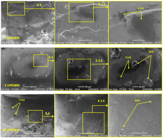 SEM images of the UPR and UPR/MW composites are presented in Figure 5. These images were taken to investigate the microstructure and morphology of the UPR matrix. The results illustrate the effective dispersion of marble particles within the matrix. The use of smaller fillers has improved their distribution in the polymer matrix, consequently enhancing the mechanical properties of these materials [52]. Additionally, the images reveal the presence of voids, which result from the evolution of volatile gases during the composite manufacturing and curing process [53]. Indeed, the gas released during the manufacture of UPR composites is mainly styrene [54], which results from the chemical reaction between the unsaturated polyester resin and the catalyst used as a diluent. The latter not only helps mixing before curing, but also contributes to polymerization while the resin is curing. The gas generated often remains confined within the matrix as an air bubble, forming unconnected pores [55]. As a result, mechanical properties are highly dependent on the defects and pores present in the microstructure. In the literature, two widely used solutions are available to overcome the problem of void formation. The first is to use resin transfer molding technologies. The second is vacuum vibrocompression. These solutions allow all air bubbles to be removed, thus improving mechanical properties [56,57].