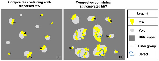 Schematic diagram of microstructure in MW modified containing (a) well-dispersed MW and (b) agglomerated MW.