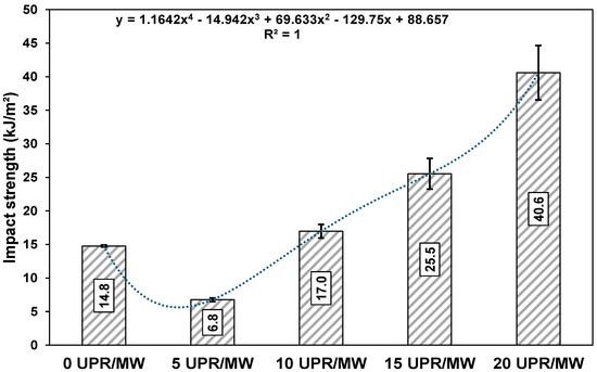Figure 10 shows the impact strength results, highlighting the positive effect of adding MW fillers. An initial decrease in impact resistance is observed at 5 UPR/MW; however, beyond this point, impact strength increases with the MW content, reaching a maximum of 40.6 KJ/m2 for 20 UPR/MW. This improvement can be attributed to the enhanced cohesion between the matrix and the filler, which promotes better energy absorption during impact [69].