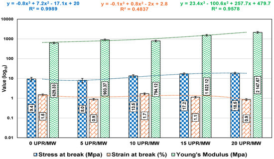 Figure 11 presents the tensile strength results, showing that the addition of MW fillers significantly enhances the tensile strength, reaching an optimum value of 18.5 MPa for the 20 UPR/MW composite. These results align with those obtained for impact strength and are consistent with findings in the literature [70]. This improvement can be attributed to the chemical bonding between the matrix and filler, as confirmed by FTIR analysis, which enhances stress transfer and contributes to higher tensile strength.