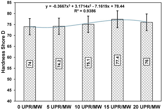 Figure 12 illustrates the Shore D hardness values measured for the composites. The results indicate a progressive increase in hardness with the introduction of an MW filler, rising from 74 for 0 UPR/MW to 77.4 for 15 UPR/MW, representing a 4.6% improvement. This enhancement in hardness can be attributed to the better dispersion of MW fillers at incorporation rates below 20 wt.%, which promotes the formation of a solid interface between the matrix and fillers with fewer defects, as confirmed by SEM imaging analyses.